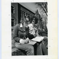 A photo of two students working on school work in front of Marsh Hall at Pacific University. Photograph originally published in Fall 1979 Viewbook.