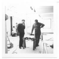 A photo of two men going over the plans for the Warner Hall renovation project at Pacific University.
