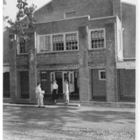 Fred Halverson, Barbara Wylie, and Virginia Lynn, the Dean of Women, standing outside the main door to Warner Hall at Pacific University. The hall was moved from Camp Adair after World War II and the exterior was bricked over during the renovation to make it suitable for the University's use.