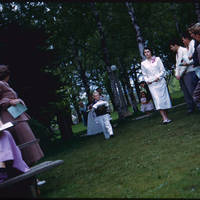 A young boy carries the Queen's crown in the May Day court procession at Pacific University's 1951 May Day Celebration. Pat Green, May Day Chairman, stands to the right.