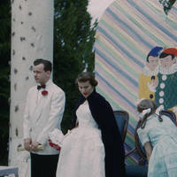 The May Day Queen, Jean Hunt, and her escort, Fred Halverson, stand before their thrones at Pacific University's 1951 May Day Celebration.