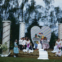 Jesters on the stage with signs at Pacific University's 1951 May Day Celebration.