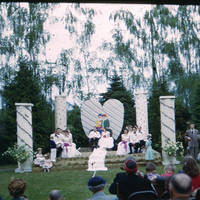 The May Day Queen, Jean Hunt, and her escort, Fred Halverson, sit on thrones while a man to the right of the stage gives a speech at Pacific University's 1951 May Day Celebration.
