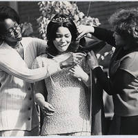 A young woman is crowned and caped at a Pacific University event. She may be the May Day Queen.