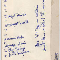 [back] 1 -, 2 -, 3 -, 4 Janet Ingram, 5 Eliz. Briggs, 6 Georgia Kessi, 7 -, 8 Norma Hope, 9 -, 10 -, 11 Margaret Lowell, 12 -, 13 Hazel Davies, 14 -, 15 -, 16 -, 17 -, Joe McCoy in center, don't know what the occasion