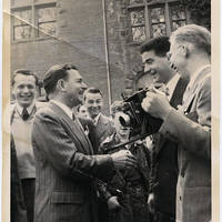 A group of men shake hands with a Pacific University campus visitor outside of Marsh Hall. The visiting man is wearing a pinstripe suit. Another man stands to the right with a camera.