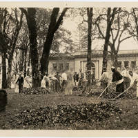 Students rake leaves outside of Carnegie Hall at Pacific University on the annual Cleaning Day. Carnegie Hall served as the school library at the time.