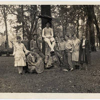 Students dressed up on Pacific University's annual Cleaning Day. One of the young men, in the middle on a stump, is wearing women's underwear including a corset. See also PUApic_009722.