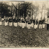 Pacific University's student marching band poses in formal wear in front of some trees.