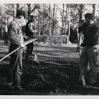 A group of male students raking leaves on Pacific University's annual Clean-Up Day.