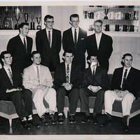 A group of male students in formal wear sit for a photograph. They are likely a fraternity or other group on campus.