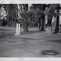 A memorial plaque in the concrete near the entrance of the Pacific University campus in 1959. See also PUApic_009760.