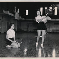 One student demonstrates a tennis swing to another in Pacific University's Old Gym.