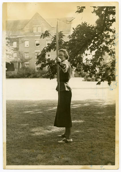 Female archer in front of Herrick Hall