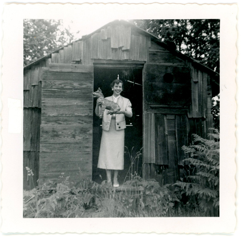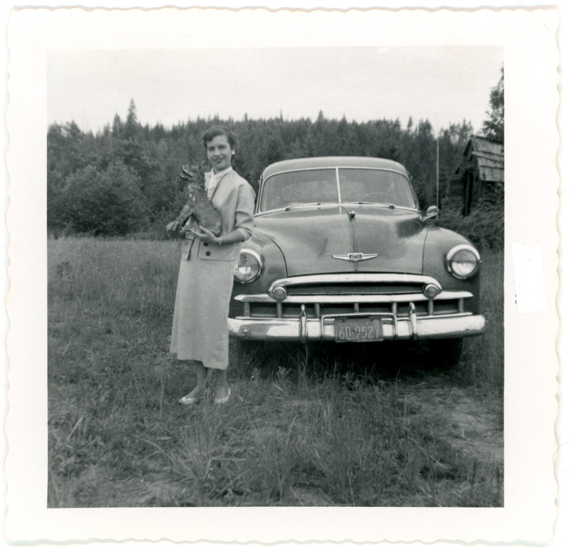 Dottie Generaux holding Boxer by a Chevrolet sedan