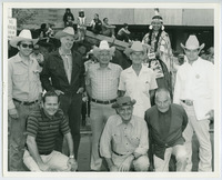 Judges for the 1980 American Indian Beauty Pageant pose for the camera at the Pendleton Round-Up. Standing left to right: Jeff Waarvick; Ned Look; Neil Farmer; Rudolph Maximillian Crommelin from Holland; and Doug Corey. Kneeling left to right: Harl Haas; Governor Victor Atiyeh; and Dr. Rudolph Maximillian Crommelin from Portland.