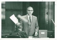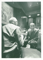 Former Governor Tom McCall, left, gestures as he makes a comment in a final three-way Republican gubernatorial candidate debate held at the Greater Medford Chamber of Commerce. State Senator, Victor Atiyeh, center, and State Representative, Roger Martin, right, also featured.