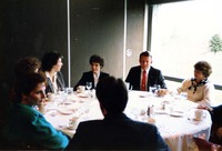 Atiyeh, in a monogrammed apron, cuts and serves pie while standing beside former Governor Robert (Bob) Straub at a formal dinner event.