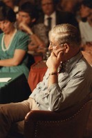 Atiyeh speaks at a roast for U.S. Senator Robert (Bob) Packwood hosted by the Greater Bend Rotary Club at the Inn of the Seventh Mountain in Bend, Oregon. In the background is a large event banner featuring a photo of Packwood as a young man. To Atiyeh's left sits feminist activist Gloria Steinem.