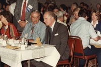 Atiyeh sits at a dinner table talking with U.S. Secretary of Commerce Malcolm Baldrige at the 1983 Western Governors' Conference in Kalispell, Montana.