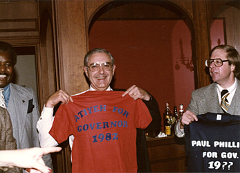 Atiyeh holding up a red t-shirt that reads 'Atiyeh for Governor 1982.' A nearby man holds a t-shirt that reads 'Paul Phillips for Gov. 19??'