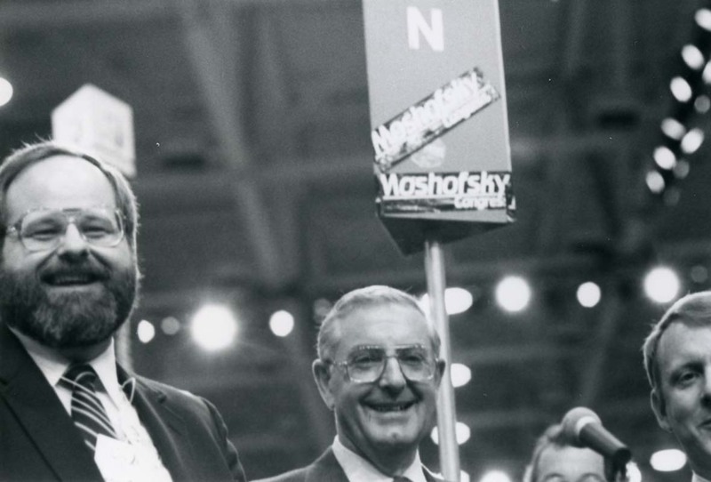 - Atiyeh stands with Press Assistant Denny Miles under a sign with campaign stickers for Congressional candidate Bill Moshofsky at the 1984 Republican National Convention in Dallas, TX.