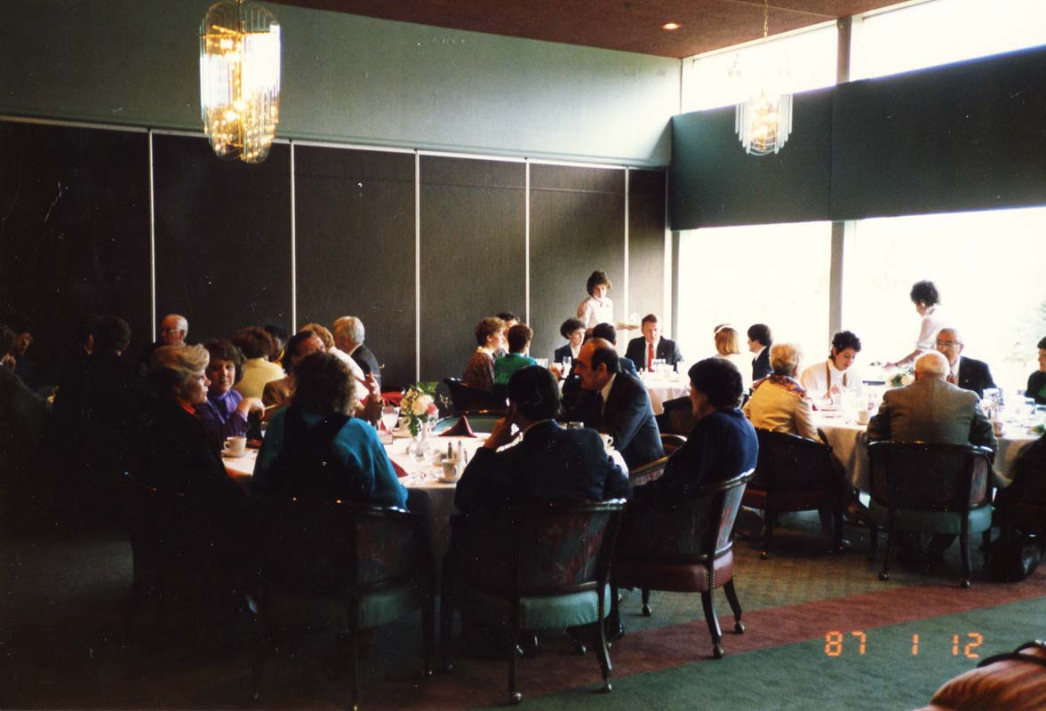 - Persons seated at tables and being waited upon during a dinner event on Atiyeh's last day in office.