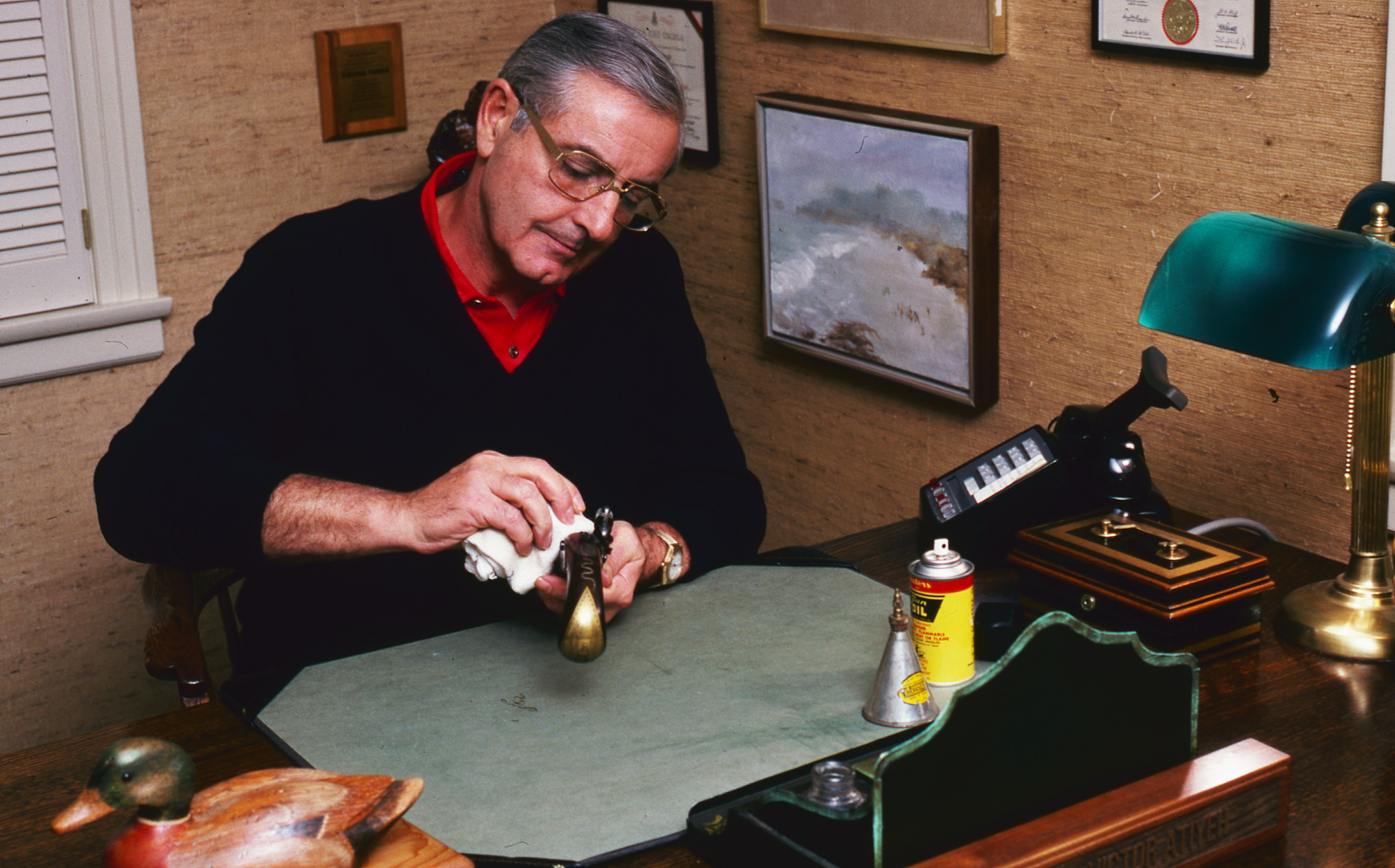 Atiyeh cleaning a gun in his home office, sitting for a publicity photograph