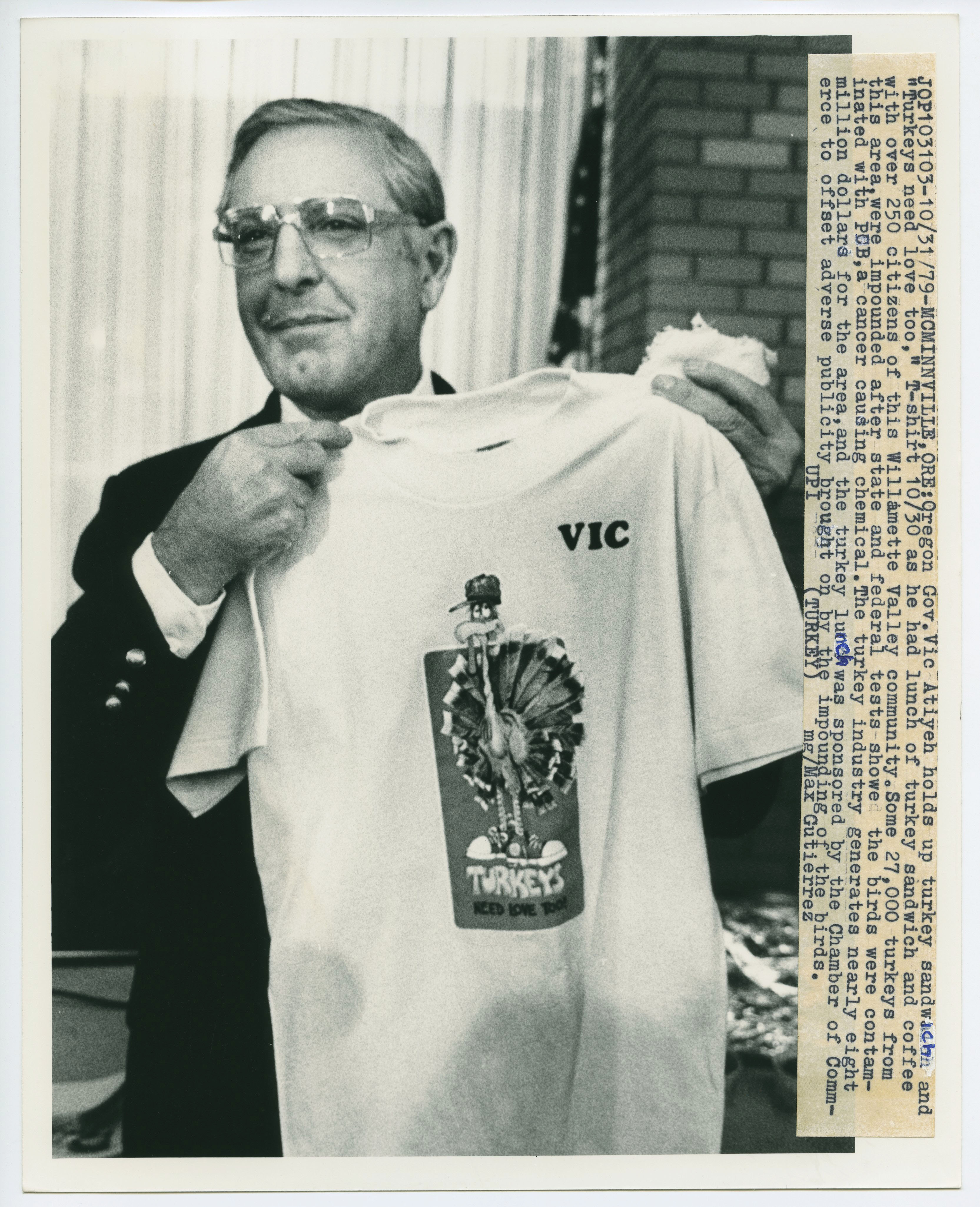 Oregon Governor Victor Atiyeh holds up a turkey sandwich and a 'Turkeys need love too' T-shirt as he has a lunch of a turkey sandwich and coffee with over 250 citizens of the Willamette Valley community. Some 27,000 turkeys from the area were impounded after state and federal tests showed the birds were contaminated with PCB, a cancer causing chemical. The turkey industry generated nearly eight million dollars for the area, and the turkey lunch was sponsored by the Chamber of Commerce to offset adverse publicity brought on by the impounding of the birds.