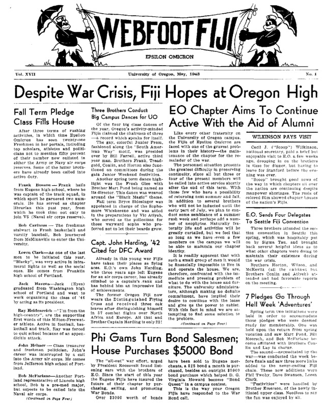 Atiyeh joined the Epsilon Omicron chapter of the Phi Gamma Delta fraternity. He embraced fraternity life, and remained in touch with many of his pledge brothers throughout the war and after leaving school. The "Fijis" produced a newsletter, one issue of which is shown here.