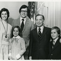 The AuCoin family poses with House Speaker Carl Albert at the U.S. House swearing-in day. Photograph by A. Dev O'Neill, the official photographer for the U.S. House of Representatives 1956-1978. In typed notes about the image, Les AuCoin writes: "My family on swearing-in day at the U.S. Capitol, 1975. Sue and I were only 15 years out Redmond Union High School when I took the congressional oath for the first time at the U.S. Capitol. We enrolled Stacy and Kelly at John Eaton Grade School in northwest Washington's Cleveland Park neighborhood. Kelly, a second grader, was almost as tall as Speaker Carl Albert." This is one of a collection of digitized objects from the Les AuCoin Papers (MS.147) at the Pacific University Archives. The original photo remains with the AuCoin family.