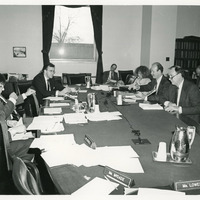 Dr. Eldon Hout testifies at a meeting of the Subcommittee on Interior, Environment, and Related Agencies, part of the House Committee on Appropriations. In typed notes about the image, Representative Les AuCoin writes: "Dr. Eldon Hout, at the microphone, was one of my political science professors when I studied at Pacific. That's me across the table at the far end. At this time, Eldon was with the National Oceanographic and Atmospheric Administration." A handwritten note on the back of the photo reads "Interior Subcommittee, Eldon Hout from Oregon D.L.C.D." The photo was probably taken in the 1980s. This is one of a collection of digitized objects from the Les AuCoin Papers (MS.147) at the Pacific University Archives. The original photo remains with the AuCoin family.