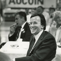 Representative Les AuCoin sits and laughs at a banquet in his name. In typed notes about the image, AuCoin writes: "Celebratory banquet in my honor. Toward the end of my career, there were dinners staged to celebrate my work and tell funny stories at my expense. This is one of those in Portland. This is a rare shot showing unbridled joy." Based on these notes, the photo was taken in the early 1990s. This is one of a collection of digitized objects from the Les AuCoin Papers (MS.147) at the Pacific University Archives. The original photo remains with the AuCoin family.