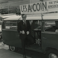 Representative Les AuCoin poses in front of his campaign bus, which is covered in signs for his first campaign for the Oregon House of Representatives. In typed notes about the image, Les AuCoin writes: "Campaign bus, my first race for the Oregon House. We rigged up our family VW bus in 1970 to push for my election. In this picture, I am posed in downtown Hillsboro." This is one of a collection of digitized objects from the Les AuCoin Papers (MS.147) at the Pacific University Archives. The original photo remains with the AuCoin family.