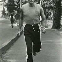 Representative Les AuCoin jogs though a Portland neighborhood. In typed notes about the image, AuCoin writes: "Jogging before a day of meetings and travel in the district. Congress is a desk job. Meetings, travel, meetings, and travel. To stay in shape, I habitually jogged early in the mornings before the business day during trips home to my district. My major route took me from Portland's South Park blocks up Terwilliger Boulevard to what is now the Chart House Restaurant and then back. By 7 am I would be cleaned up and ready for the day's schedule." The photo was probably taken in the 1980s. This is one of a collection of digitized objects from the Les AuCoin Papers (MS.147) at the Pacific University Archives. The original photo remains with the AuCoin family.