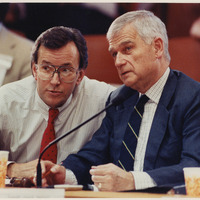 Representative Les AuCoin and Senator Mark Hatfield speak at the 1989 "timber summit" between Oregon's congressional delegation, federal land-management officials, timber industry representatives, and environmentalists. In typed notes about the image, AuCoin writes: "Mark Hatfield and me conferring. At the "timber summit" in Salem that we called to find common ground between the members of the timber industry and environmental activists." A note on the back of the photo reads "Les and Hatfield, "Timber Summit", Salem, City Hall, 6/24/89". The back of the photo is also stamped with "The Oregonian". This is one of a collection of digitized objects from the Les AuCoin Papers (MS.147) at the Pacific University Archives. The original photo remains with the AuCoin family.