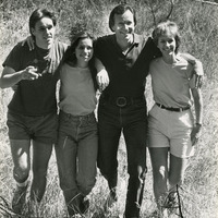 The AuCoin family poses in a field for a family portrait. From left to right, Kelly, Stacy, Les, and Sue AuCoin. The photo was probably taken in the late 1980s. A note on the back reads "Dave Swan Photography". This is one of a collection of digitized objects from the Les AuCoin Papers (MS.147) at the Pacific University Archives. The original photo remains with the AuCoin family.