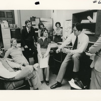 Representative Les AuCoin sits in his congressional office, surrounded by his staff. In typed notes about the image, AuCoin writes: "An impromptu staff meeting in 1975, my freshman year. In the last 10 to 12 years of my career, my office had one of the lowest turnover rates in the House." This is one of a collection of digitized objects from the Les AuCoin Papers (MS.147) at the Pacific University Archives. The original photo remains with the AuCoin family.