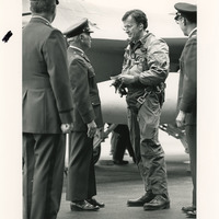 Representative Les AuCoin speaks to members of the Oregon Air Guard in front of F-16 fighters. In typed notes about the image, AuCoin writes: "As a member of the defense committee, I reassigned a fleet of F-16s to the Oregon Air Guard. To commemorate the transfer, I rode in one of the fighters to Portland from Salt Lake City." This is one of a collection of digitized objects from the Les AuCoin Papers (MS.147) at the Pacific University Archives. The original photo remains with the AuCoin family.