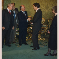 Representative Les AuCoin and his wife Sue meet Mikhail Gorbachev, President of the Soviet Union. In typed notes about the image, AuCoin writes: "Sue and I were members of Speaker Jim Wright's 1986 mission to Moscow. At the Kremlin, I talked briefly with Mikhail Gorbachev about a bill I helped pass that banned flight tests on anti-satellite weapons. It was the first form of arms control ever conceived in and passed by Congress. Sue stands behind me." This is one of a collection of digitized objects from the Les AuCoin Papers (MS.147) at the Pacific University Archives. The original photo remains with the AuCoin family.