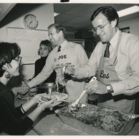 Representative Les AuCoin and then-Senator Joe Biden serve spaghetti at a birthday fundraiser for AuCoin. In typed notes about the image, AuCoin writes: "The annual spaghetti feed at Catlin Gable School was a mainstay in each of my campaigns. The event didn't raise a lot of money, but small and even large donors came to count on it. Usually, I had a V.I.P. guest who helped me serve pasta and then pitched my candidacy to the crowd. Here, then-senator Joe Biden serves up his big trademark smile with the pasta." This is one of a collection of digitized objects from the Les AuCoin Papers (MS.147) at the Pacific University Archives. The original photo remains with the AuCoin family.