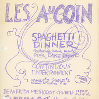 Hand-drawn flyer advertising "An Evening for Les AuCoin Spaghetti Dinner, featuring homemade pies, cakes, and bread, Continuous Entertainment" at the Beaverton Methodist Church on Sunday October 11th, 1970. Representative Les AuCoin often held spaghetti dinners during his campaigns for office, and this one was for his first campaign for state representative in Oregon. This is one of a collection of digitized objects from the Les AuCoin Papers (MS.147) at the Pacific University Archives and can be found in Box 11, Folder 26.