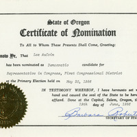 Certificate recording the nomination of Les AuCoin as the "Democratic candidate for Representative in Congress, First District, at the Primary Election held May 20, 1986". Signed by Barbara Roberts, Secretary of State, on June 19th, 1986. This is one of a collection of digitized objects from the Les AuCoin Papers (MS.147) at the Pacific University Archives and can be found in Box 25, Folder 7.