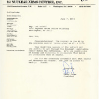 Letter to Representative Les AuCoin from David Cohen, President of the Professionals' Coalition for Nuclear Arms Control. In the letter, Cohen thanks Representative AuCoin for his opposition of MX missiles and contributions to arms control. This is one of a collection of digitized objects from the Les AuCoin Papers (MS.147) at the Pacific University Archives and can be found in Box 25, Folder 7.
