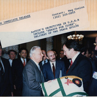 Representative Les AuCoin presents a peace quilt sewn in Forest Grove, Oregon to a group of politicians in the Soviet Union. PUA_MS147_122 offers a description of the quilt: "This quilt was stitched by the women of the Forest Grove Stitchery Group. In the fall of 1983, this group began planning an Oregon peace quilt that would demonstrate to the women of the Soviet Union, especially, that the women of the U.S.A. stood for friendship and peace between our two countries." This is one of a collection of digitized objects from the Les AuCoin Papers (MS.147) at the Pacific University Archives. It originally appeared in an AuCoin family scrapbook documenting U.S. House Speaker Jim Wright's visit to Spain, the Soviet Union, and the Federal Republic of Germany in April 1987. The congressional delegation included Representative Les AuCoin and his wife Sue. Other members of congress on the trip included Tony Coelho, Dick Cheney, Jim Howard, Les Aspin, John Paul Hammerschmidt, Jim Scheuer, Lawrence Coughlin, Ralph Regula, Carrol Hubbard, Tom Downey, Norm Dicks, Wes Watkins, Mickey Leland, Steny Hoyer, Esteban Torres, and Sherwood Boehlert. The AuCoin family loaned the scrapbook to Pacific University Archives in 2022 for digitization, and the scrapbook remains with the AuCoin family.