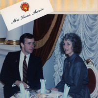 Representative Les AuCoin and his wife Sue at a banquet held in the Mariyinsky Palace in Kyiv. Sue AuCoin's place card appears above the photo. The banquet was held on April 16th, 1987. This is one of a collection of digitized objects from the Les AuCoin Papers (MS.147) at the Pacific University Archives. It originally appeared in an AuCoin family scrapbook documenting U.S. House Speaker Jim Wright's visit to Spain, the Soviet Union, and the Federal Republic of Germany in April 1987. The congressional delegation included Representative Les AuCoin and his wife Sue. Other members of congress on the trip included Tony Coelho, Dick Cheney, Jim Howard, Les Aspin, John Paul Hammerschmidt, Jim Scheuer, Lawrence Coughlin, Ralph Regula, Carrol Hubbard, Tom Downey, Norm Dicks, Wes Watkins, Mickey Leland, Steny Hoyer, Esteban Torres, and Sherwood Boehlert. The AuCoin family loaned the scrapbook to Pacific University Archives in 2022 for digitization, and the scrapbook remains with the AuCoin family.