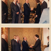 This scrapbook page includes two photos of Representative Les AuCoin and his wife Sue meeting Mikhail Gorbachev, General Secretary of the Communist Party of the Soviet Union. See also PUA_MS147_121 and PUA_MS147_37 for other images of the meeting. This is one of a collection of digitized objects from the Les AuCoin Papers (MS.147) at the Pacific University Archives. It originally appeared in an AuCoin family scrapbook documenting U.S. House Speaker Jim Wright's visit to Spain, the Soviet Union, and the Federal Republic of Germany in April 1987. The congressional delegation included Representative Les AuCoin and his wife Sue. Other members of congress on the trip included Tony Coelho, Dick Cheney, Jim Howard, Les Aspin, John Paul Hammerschmidt, Jim Scheuer, Lawrence Coughlin, Ralph Regula, Carrol Hubbard, Tom Downey, Norm Dicks, Wes Watkins, Mickey Leland, Steny Hoyer, Esteban Torres, and Sherwood Boehlert. The AuCoin family loaned the scrapbook to Pacific University Archives in 2022 for digitization, and the scrapbook remains with the AuCoin family.