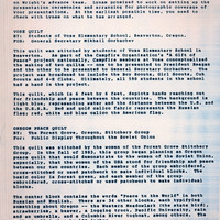 This document describes two peace quilts created in Oregon as gifts for the Soviet Union. The Vose Quilt, created by students of Vose Elementary School in Beaverton, Oregon, was one of two matching quilts created for U.S. President Regan and General Secretary Mikhail Gorbachev. The Oregon Peace Quilt, created by the Forest Grove Stitchery Group, was created to "demonstrate to the women of the Soviet Union, especially, that the women of the U.S.A. stood for friendship and peace". See also PUA_MS147_116, PUA_MS147_125, PUA_MS147_126 for images of the quilts. This is one of a collection of digitized objects from the Les AuCoin Papers (MS.147) at the Pacific University Archives. It originally appeared in an AuCoin family scrapbook documenting U.S. House Speaker Jim Wright's visit to Spain, the Soviet Union, and the Federal Republic of Germany in April 1987. The congressional delegation included Representative Les AuCoin and his wife Sue. Other members of congress on the trip included Tony Coelho, Dick Cheney, Jim Howard, Les Aspin, John Paul Hammerschmidt, Jim Scheuer, Lawrence Coughlin, Ralph Regula, Carrol Hubbard, Tom Downey, Norm Dicks, Wes Watkins, Mickey Leland, Steny Hoyer, Esteban Torres, and Sherwood Boehlert. The AuCoin family loaned the scrapbook to Pacific University Archives in 2022 for digitization, and the scrapbook remains with the AuCoin family.
