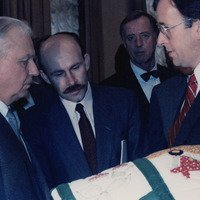 Representative Les AuCoin presents a peace quilt sewn in Forest Grove, Oregon to a group of politicians in the Soviet Union. PUA_MS147_122 offers a description of the quilt: "This quilt was stitched by the women of the Forest Grove Stitchery Group. In the fall of 1983, this group began planning an Oregon peace quilt that would demonstrate to the women of the Soviet Union, especially, that the women of the U.S.A. stood for friendship and peace between our two countries." See PUA_MS147_122 for a full description. This is one of a collection of digitized objects from the Les AuCoin Papers (MS.147) at the Pacific University Archives. It originally appeared in an AuCoin family scrapbook documenting U.S. House Speaker Jim Wright's visit to Spain, the Soviet Union, and the Federal Republic of Germany in April 1987. The congressional delegation included Representative Les AuCoin and his wife Sue. Other members of congress on the trip included Tony Coelho, Dick Cheney, Jim Howard, Les Aspin, John Paul Hammerschmidt, Jim Scheuer, Lawrence Coughlin, Ralph Regula, Carrol Hubbard, Tom Downey, Norm Dicks, Wes Watkins, Mickey Leland, Steny Hoyer, Esteban Torres, and Sherwood Boehlert. The AuCoin family loaned the scrapbook to Pacific University Archives in 2022 for digitization, and the scrapbook remains with the AuCoin family.