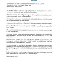 Speech by Sue AuCoin on behalf of her husband, Representative Les AuCoin, at the Campaign for a Hate Free Oregon Kickoff Rally on July 18th, 1992. In the statement, Sue AuCoin calls on Oregonians to vote against the 1992 Oregon Ballot Measure 9. The measure, which was defeated in the 1992 general election, would have added language to the Oregon constitution banning the use of state funds "to promote, encourage or facilitate homosexuality, pedophilia, sadism or masochism". This is one of a collection of digitized objects from the Les AuCoin Papers (MS.147) at the Pacific University Archives and can be found in Box 47, Folder 18.